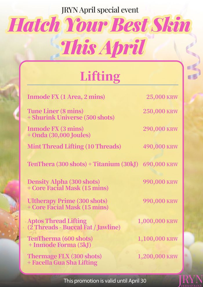 - 拉提(Ultherapy Prime 音波拉提、Thermage FLX 電波拉提、Titanium Lifting 鈦金拉提)、肉毒桿菌、水光保養及雷射 — 多數療程當日一次完成,讓您的釜山之旅不留遺憾。